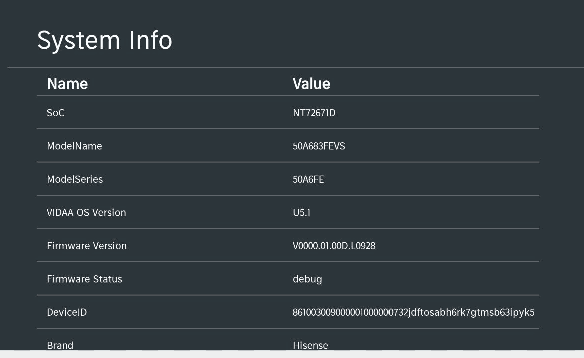 - Your VIDAA TV is manufactured or upgraded in 2021 or later (Firmware version > L0901), or verify compatibility using the platform support table below by checking the SoC and VIDAA OS Version shown in DevKit > System Info: