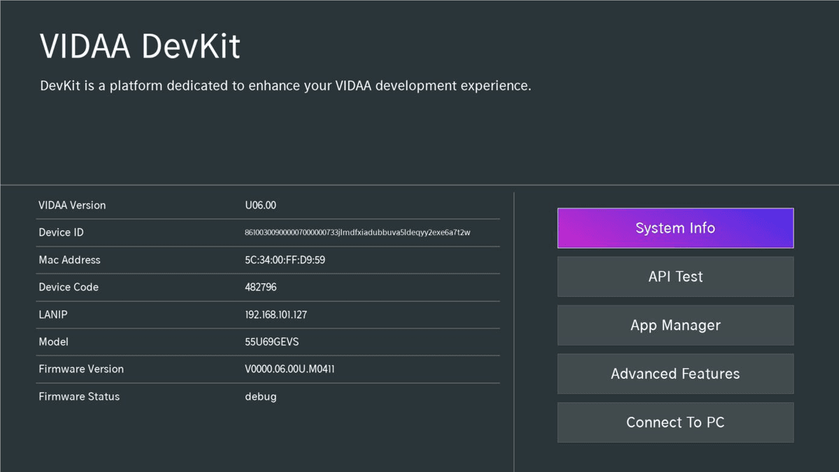 - Open DevKit. A page with key information about your TV system will appear: