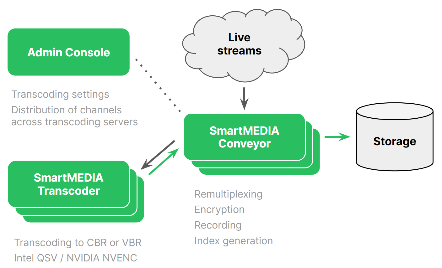The solution architecture deploys two components of the SmartMEDIA Content Delivery Platform — SmartMEDIA Conveyor and SmartMEDIA Transcoder, which can be run on separate nodes and provide high stability and scalability. Transcoding profiles can be managed via a convenient web interface.